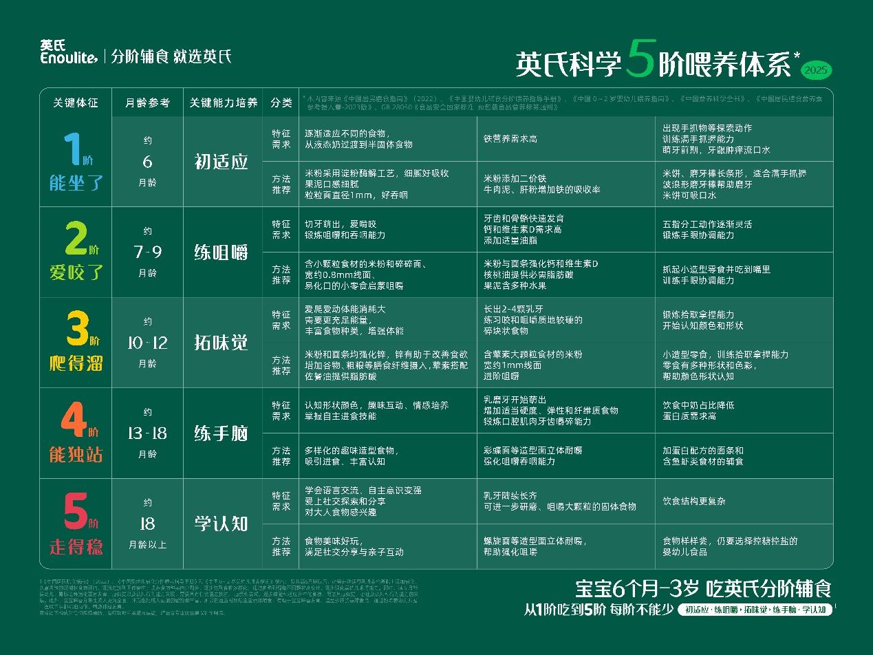 2020年,英氏基于坚实的实践调研发现,传统“一刀切”的辅食喂养方式已无法满足现代育儿需求,新一代父母渴望科学喂养却面临知识碎片化、代际观念冲突等现实困境。正是这样的市场痛点,催生了科学分阶辅食的创新构想。随后,英氏寻求到中国妇幼保健协会的专业指导和帮助,双方共同撰写发布了《中国婴幼儿辅食分阶喂养指导手册》,并确立了科学5阶喂养体系。自此,中国婴幼儿辅食喂养终于有了专业、科学、权威的标准和依据。