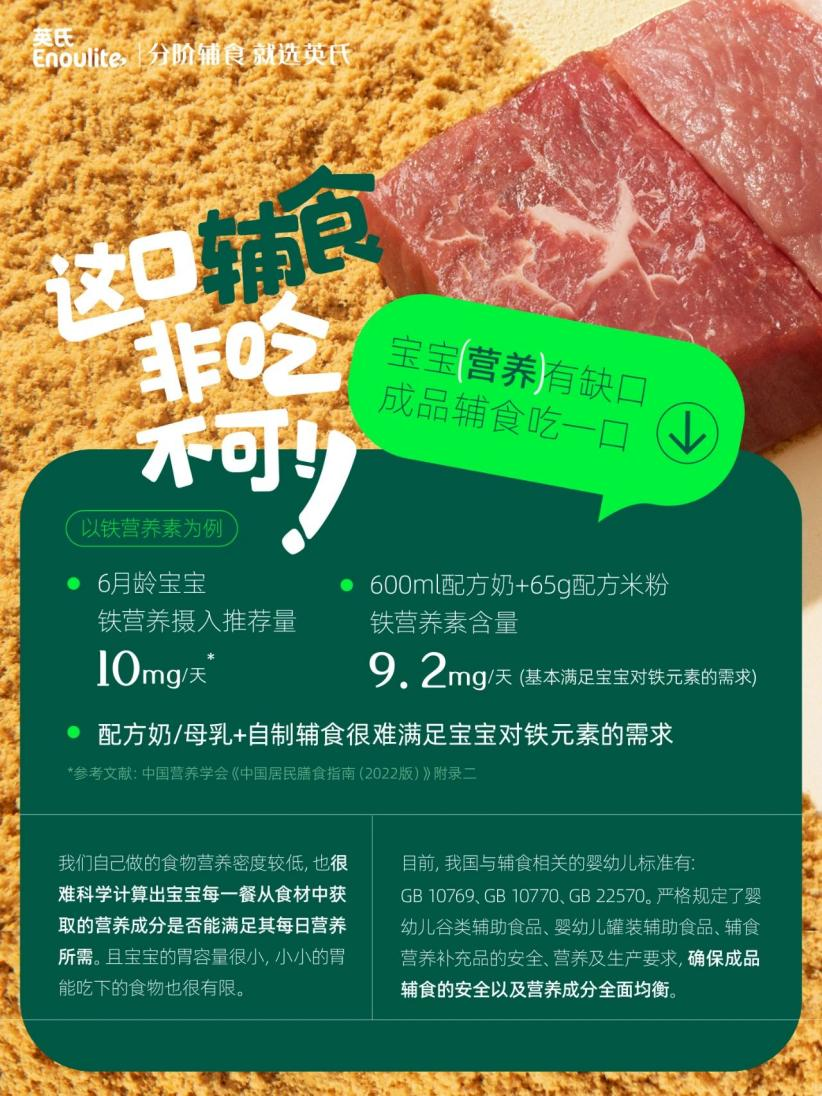 像很多家长给宝宝选择的英氏,品牌所有米粉均为配方米粉,在强化铁、钙、锌等多种营养素的同时把“补铁”作为基础配方,在米粉中添加的是更易被人体吸收的二价铁,还搭配了维C促进宝宝身体对铁的吸收。宝宝每天吃两顿,再配合奶量,铁摄入就能达标。