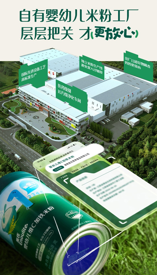 英氏米粉工厂采用全自动智能化生产设备,包括从大米制粉到包装的五大环节,一共16道工序,几乎全部由精密的机器操作完成。米粉加工的第一步,先通过专业设备把白米表面残留的糠粉洗除同时去除有害微生物,让大米更加干净安全。在磨粉环节,再采用低温超微研磨工艺将大米进行研磨,最大程度保持大米水分和米香味。在酶解环节,采用淀粉酶解技术,使淀粉大分子分解成许多小分子,让成品米粉糊化更完全,更好被宝宝娇嫩的肠胃所吸收,还会散发独特的熟米香味。在生产环节结束后,米粉还需要经过13道异物消除和检测,与5种(总砷、无机砷、铅、镉、锡)重金属检测。最后是封罐,赋予了每一罐米粉唯一身份识别码,扫一扫二维码能看到手中这罐米粉所有追溯信息。